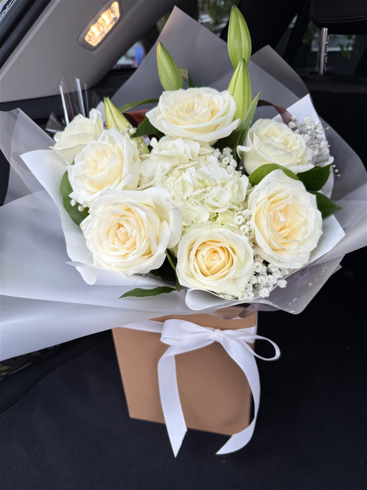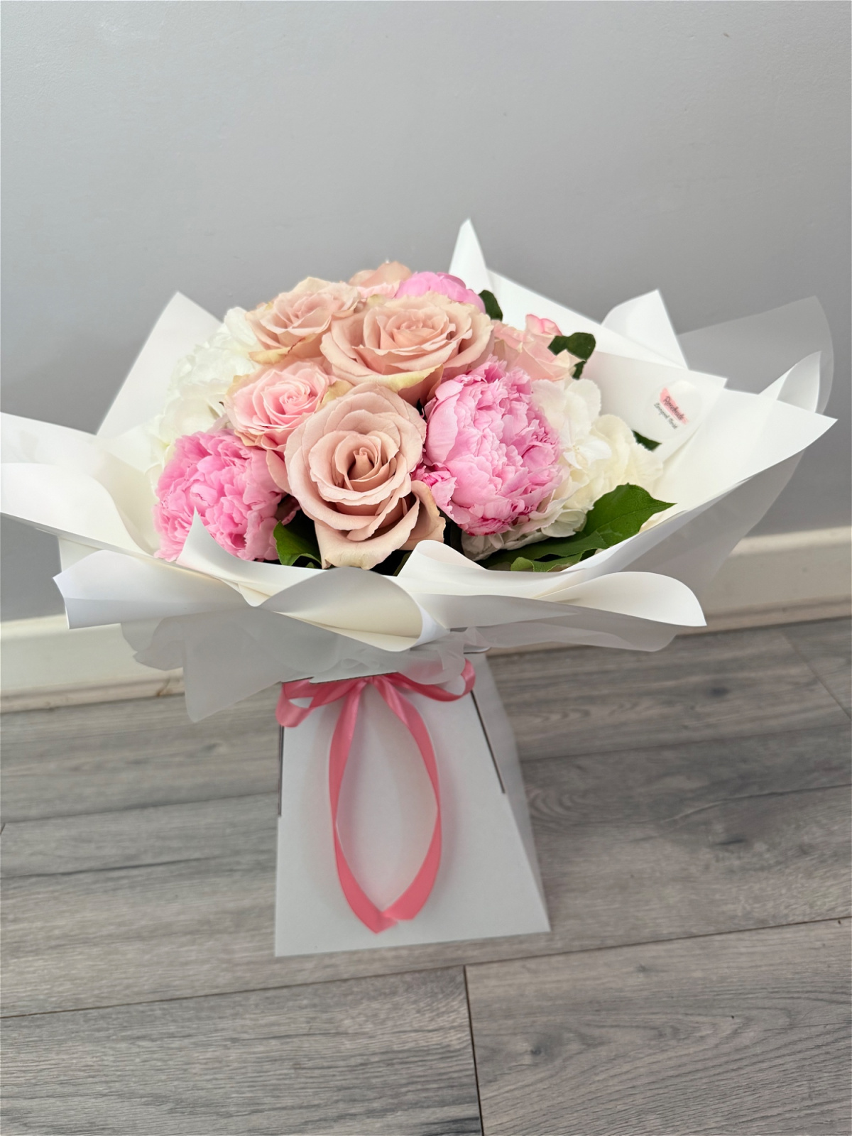 Our bouquets are made up with a mixture of fresh seasonal flowers, they come handtied in a bubble of water, these can be kept in the box and topped up with water or can be transferred to a vase.