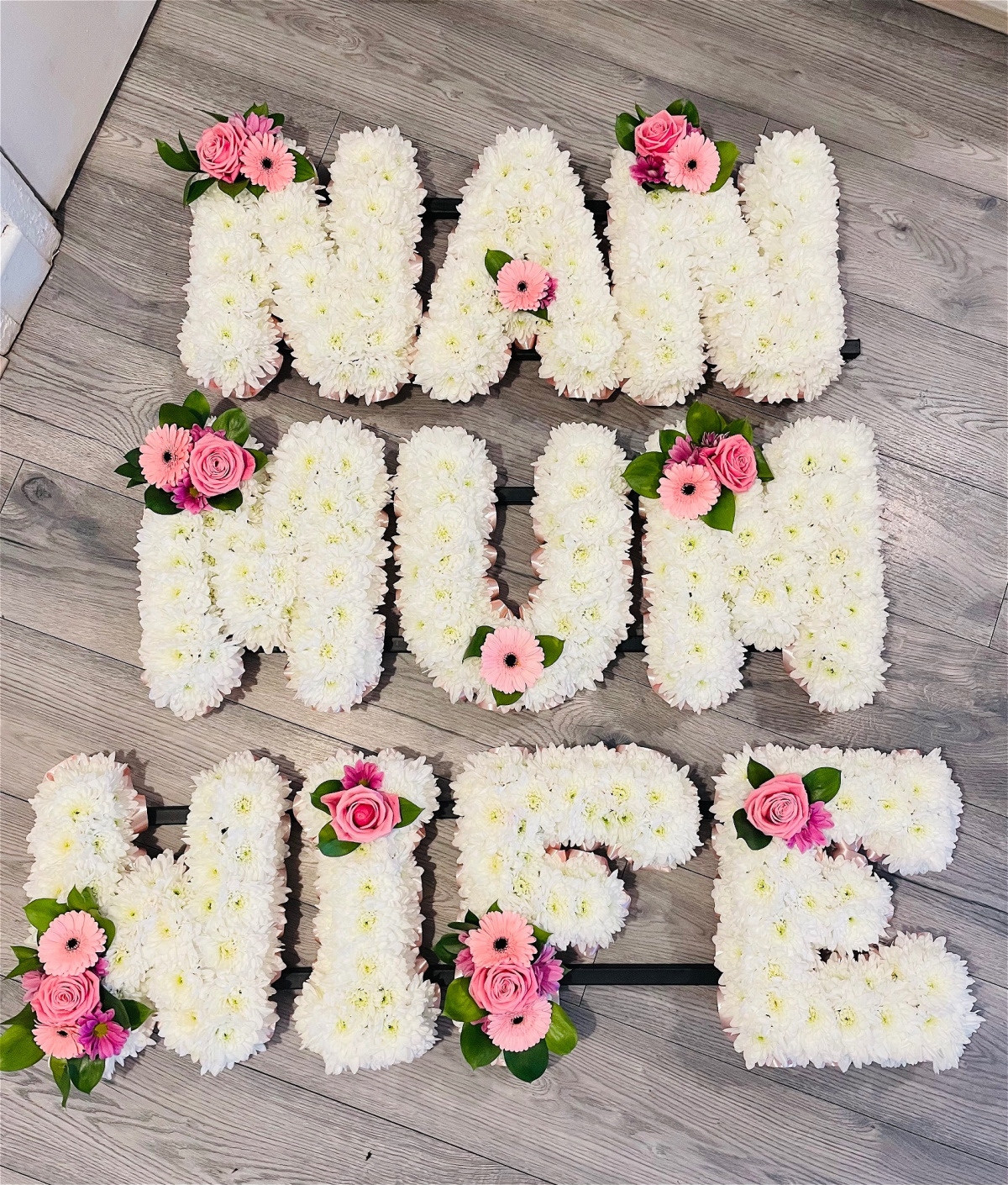 Our funeral letters are massed in white with a spray of flowers on each letter in the colour of your choice.