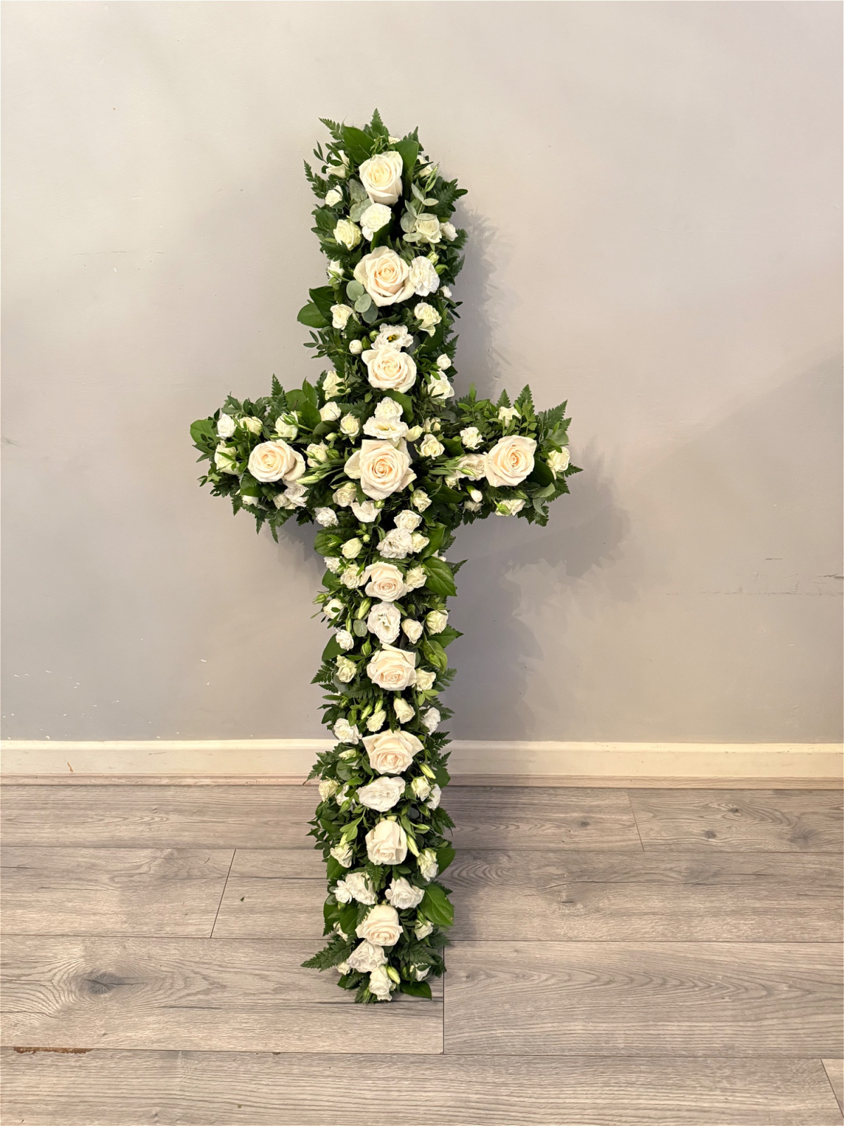 This open style cross will be filled with a mixture of fresh seasonal flowers and foliage.