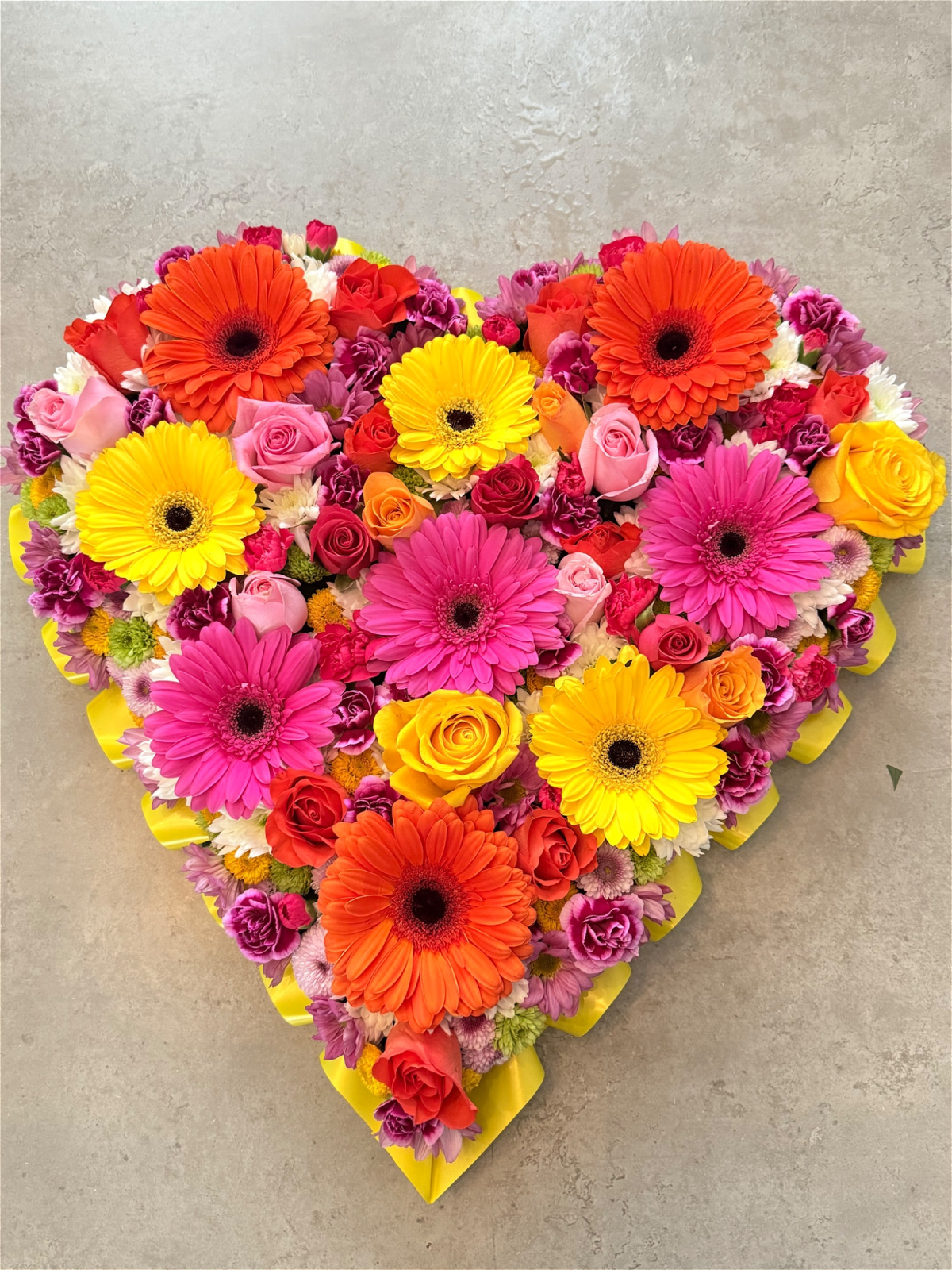 This heart tribute will be made with a mixture of fresh seasonal flowers and foliage in the colour of your choice.