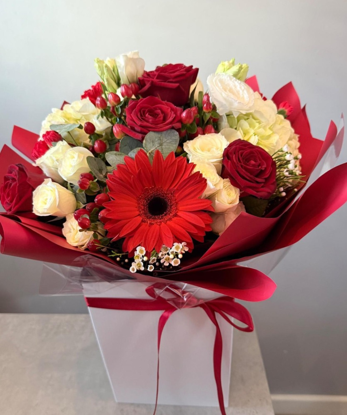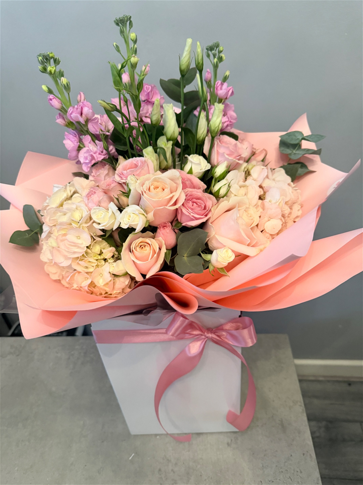 Bouquets come handtied in a bubble of water, these can be kept in the box and topped up with water or can be transferred to a vase for longer lasting freshness.